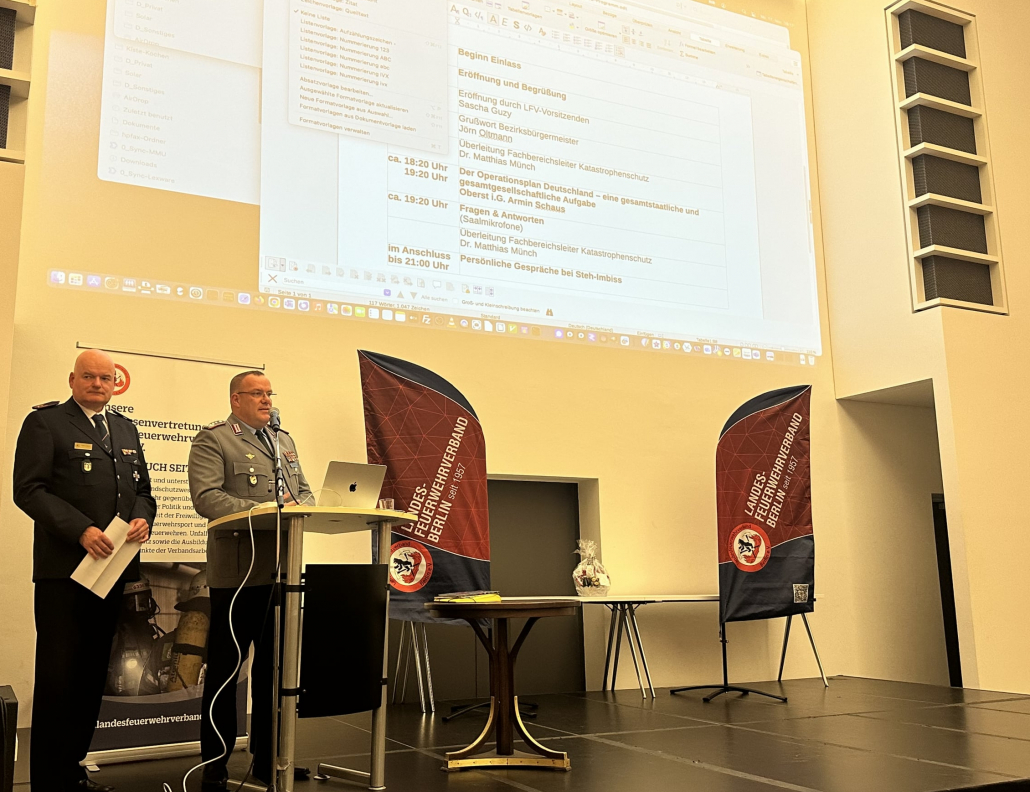 Am 17.11.2025 wurden über 100 Führungskräfte der Freiwilligen Feuerwehren über den Operationsplan Deutschland informiert. Hier stellte Herr Oberst Schaus den Operationsplan der Bundeswehr vor und stellte sich den Fragen der Gäste. Ein besonderer Dank geht an den Bezirksbürgermeister Herrn Oltmann von Berlin Tempelhof-Schöneberg, der dem Verband den Rathaussaal zur Verfügung gestellt hat.